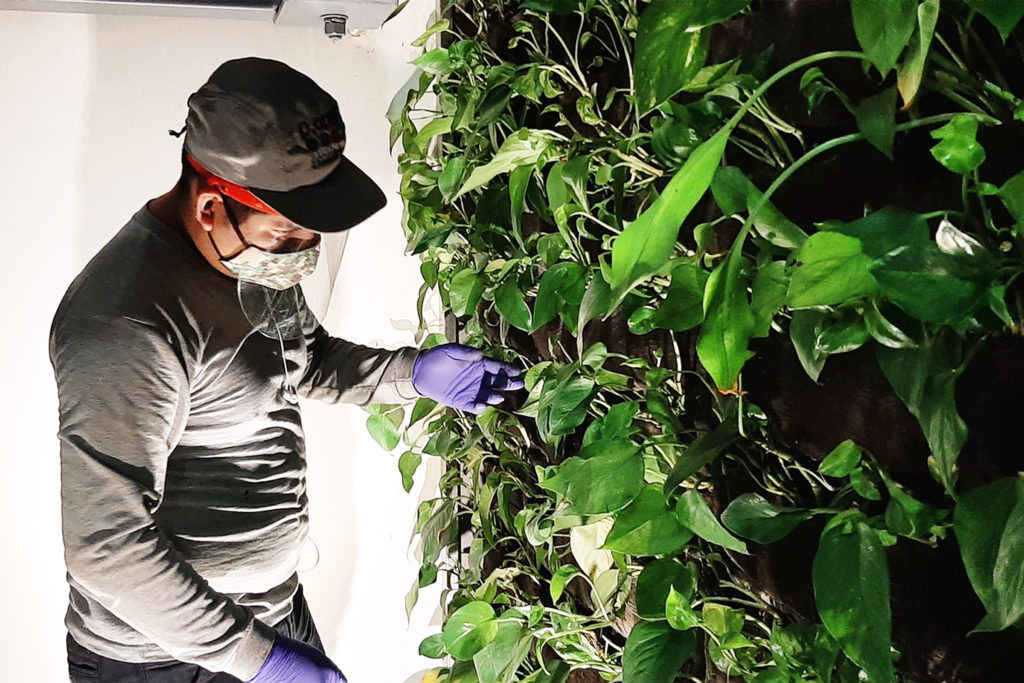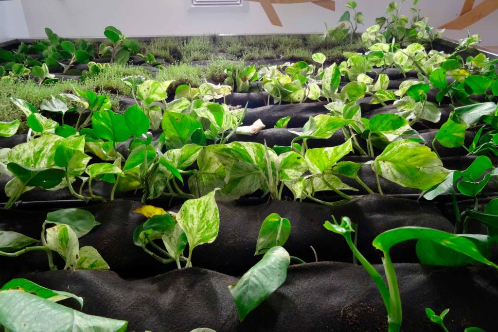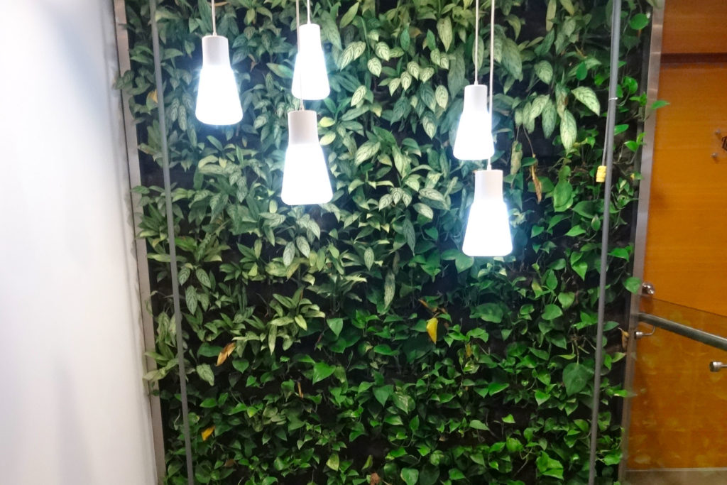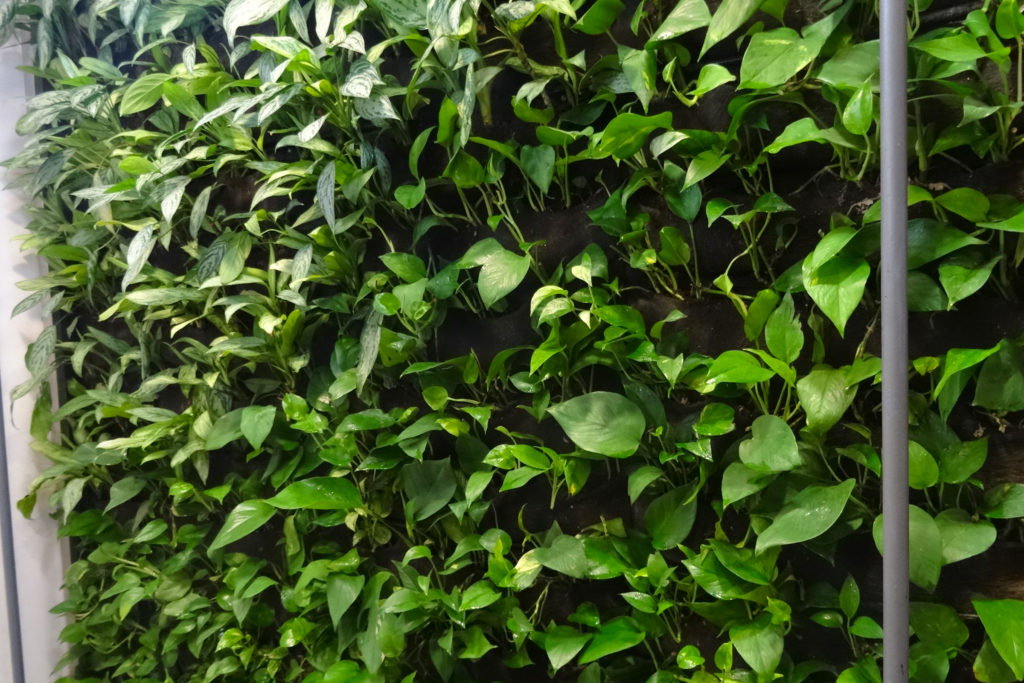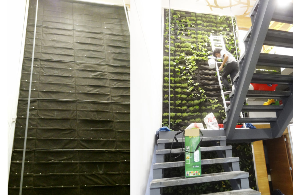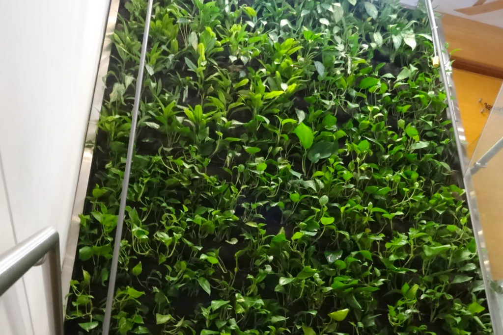 El jardín vertical o muro verde se encuentra en una doble altura, cuenta con un sistema de mantas para la vegetación y un sistema de riego tecnificado incorporado.